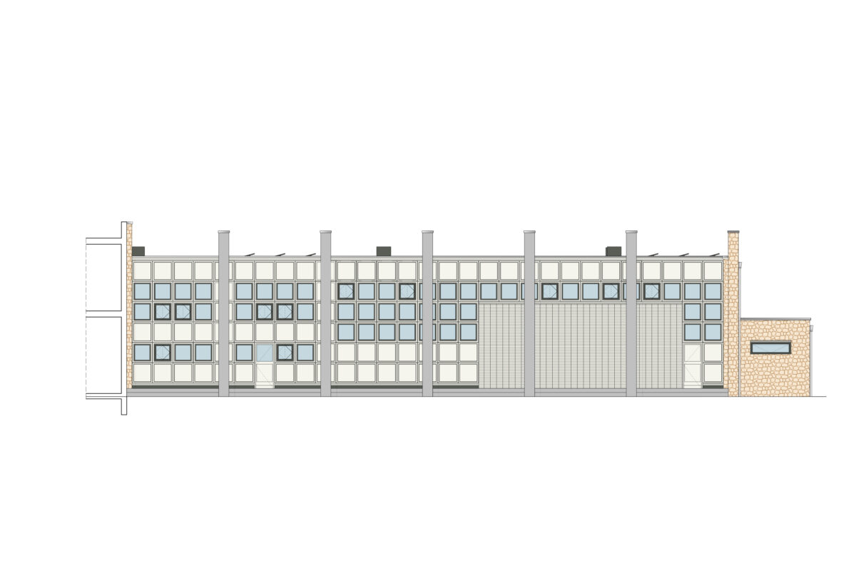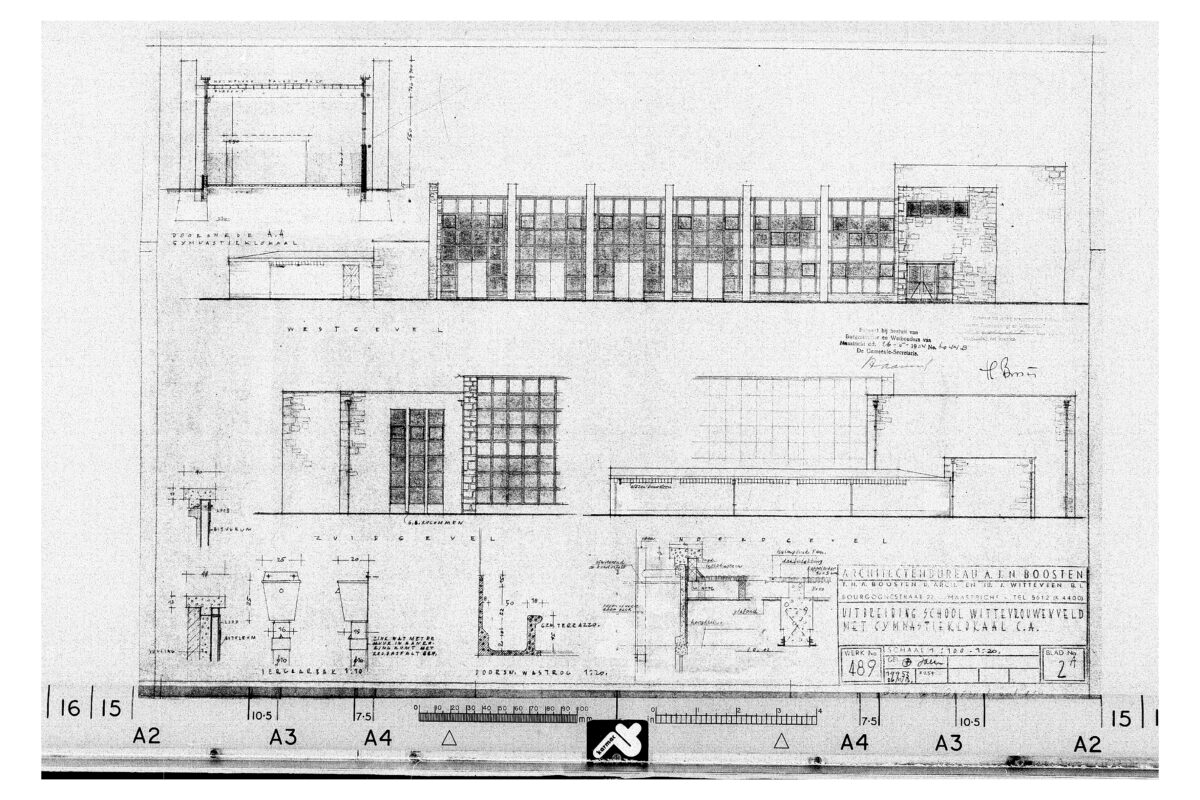 The gym on the Groene Loper in Maastricht, now a heritage listed building, was built in 1954 and designed by Theo Boosten as an extension of the Johannes Berchmansschool, originally designed by architect Frits Peutz in 1949. The building features a distinctive structural design with five concrete trusses protruding from the side walls, which are composed of square concrete modules filled with steel frames, glass or concrete. The end walls are clad in coarse-grained Kunrader stone.