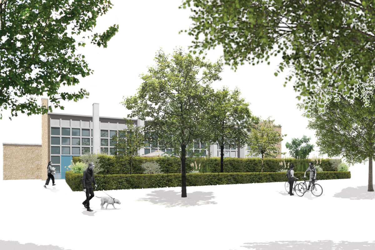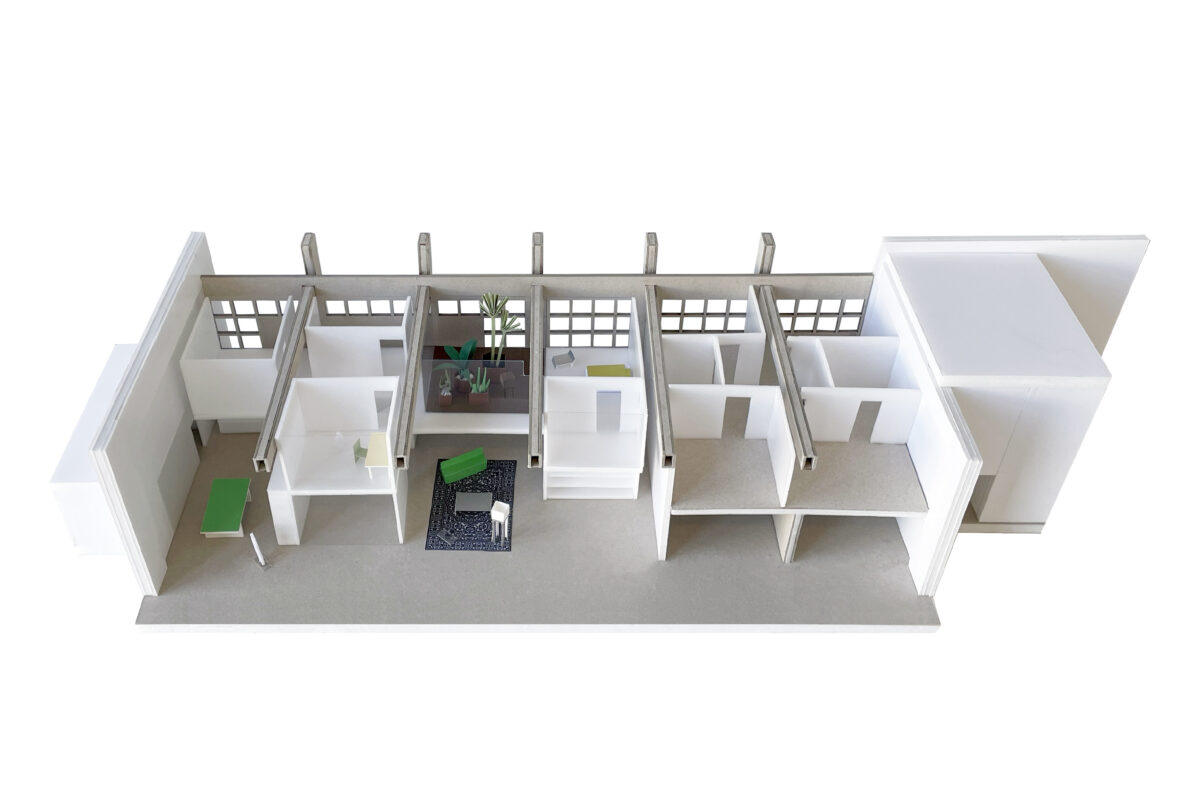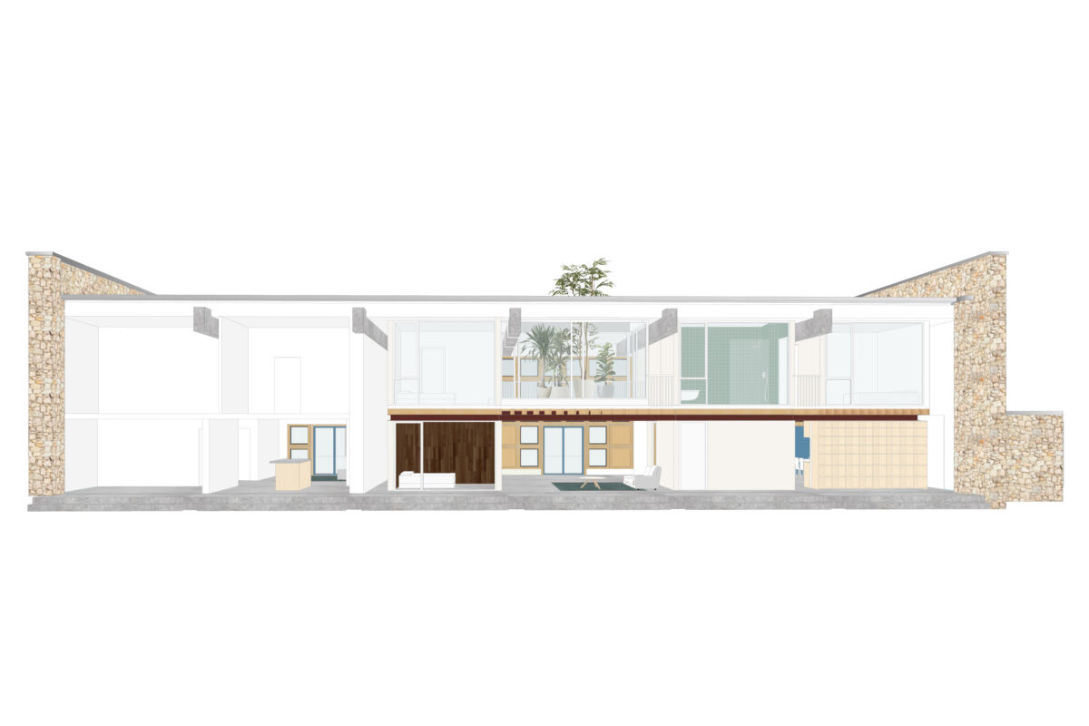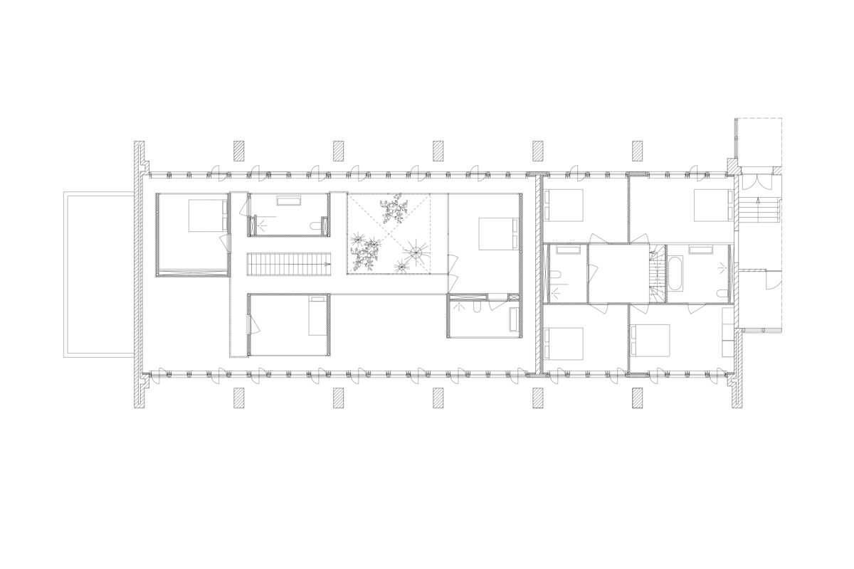 The structure will house two apartments: one in the two-storey changing area and another in the 6-m-high gym area. The layout of the apartment in the changing area follows the existing configuration of the changing rooms and lavatory facilities. In the gym area, the new rooms are designed as freestanding structures, resembling large pieces of furniture, and an internal courtyard provides a sheltered outdoor seating area.
