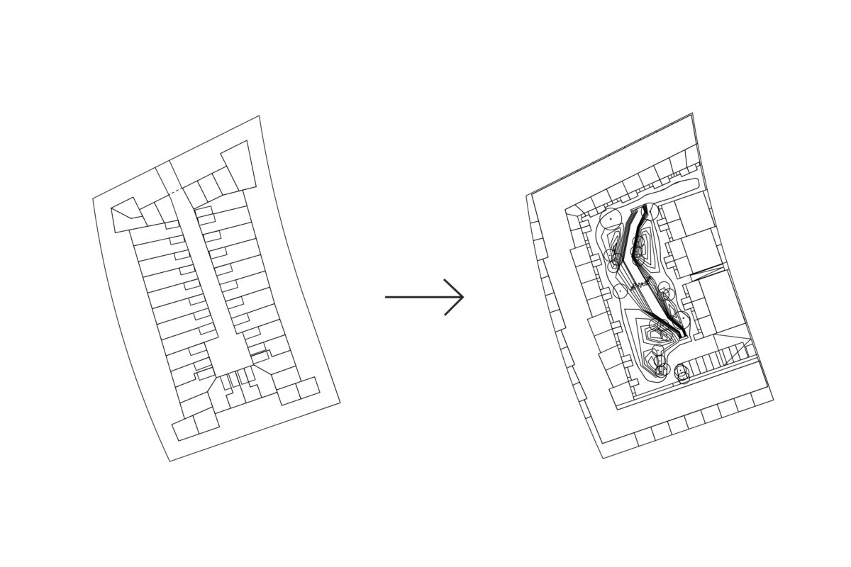 The location is elevated only where necessary for the dwellings. The largest part of the courtyard retained its current level and became a community garden: a bit of preserved landscape. All dwellings have private gardens bordering on the collective garden. A wall with planters and stairs accessing the higher gardens of the dwellings encloses the ditch-garden.