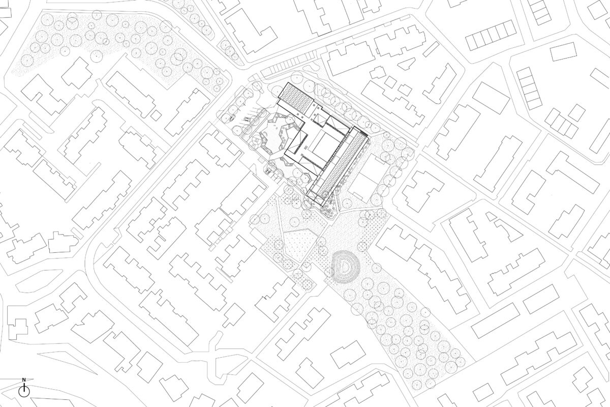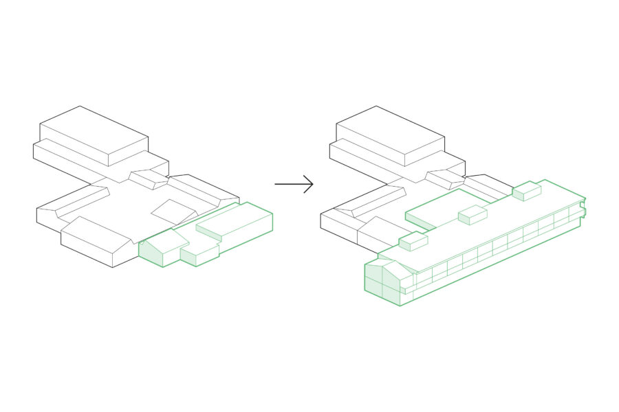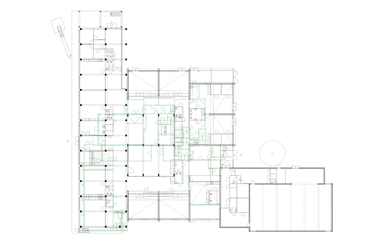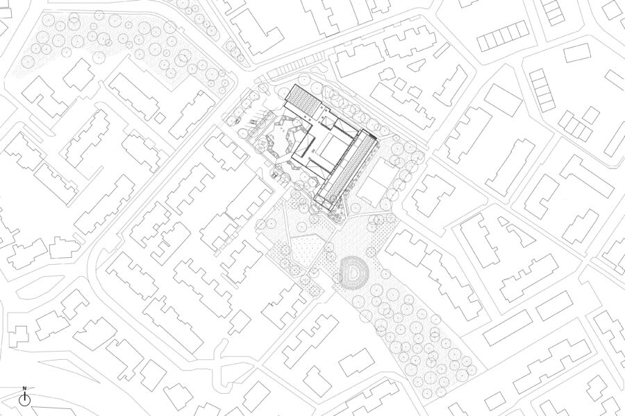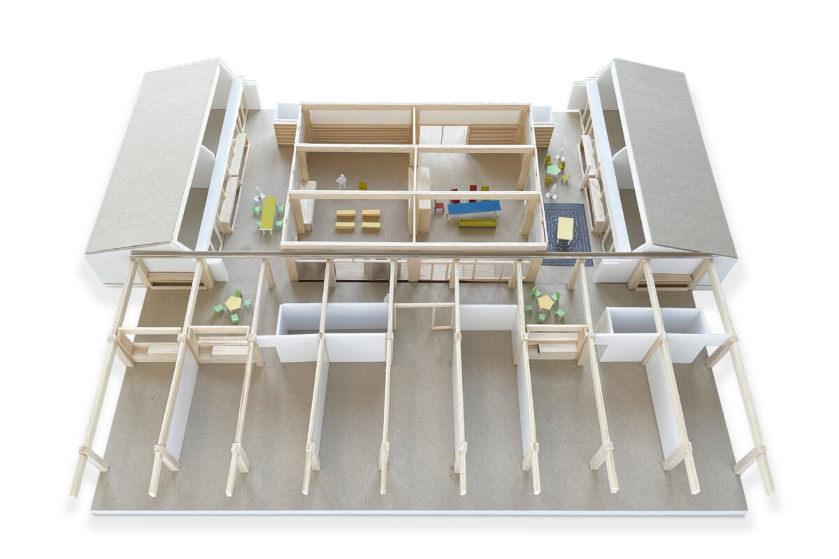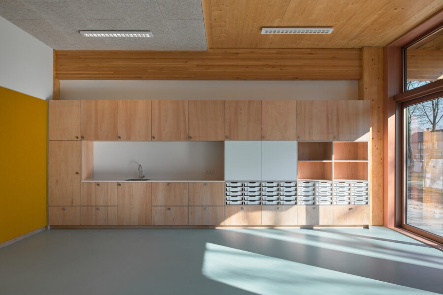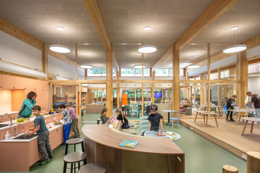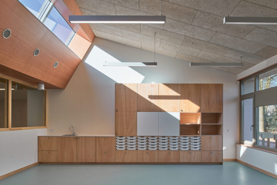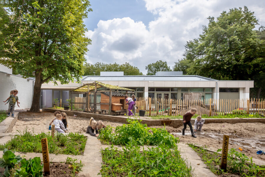 Adjacent to the main entrance of the existing building, the Child Centre is themed around ‘healthy eating’. The atmosphere is shaped by the existing tree, the vegetable plot and the chickens. Inside, the utilitarian facilities are relocated from the centre to the outer rim, transforming it into an open heart for the centre. This space features a meeting room/library, a shared area and play-learn squares. A new timber structure of columns and beams, along with a CLT floor, brings in daylight and adds height to this central area.