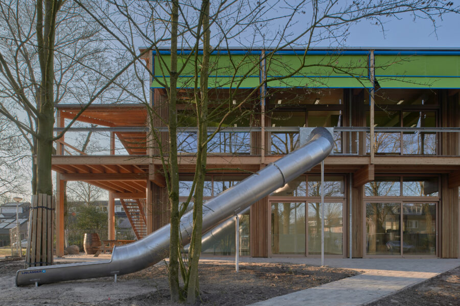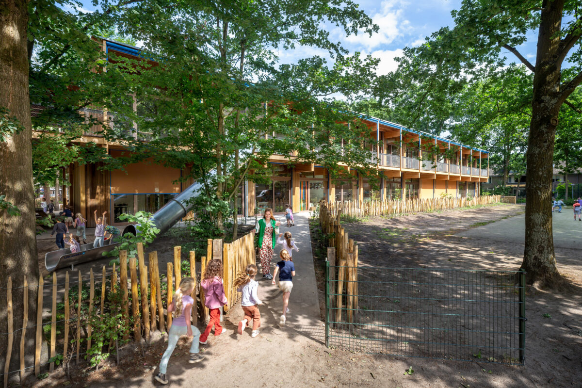 The sports field side has a new façade with a distinct second entrance for the middle and upper grades. Here, the new building establishes a connection to the sports field, themed around ‘sport and movement’, with balconies, stairs, bleachers and a slide enhancing its character. The building culminates in a shed with a covered sandpit on the ground floor and an outdoor classroom directly linked to the crafts room upstairs. The shed serves as a gateway, crow’s nest and watchtower, connecting the school, the Speelheide and the Child Centre. Surrounded by treetops, this spot is one of the school’s most remarkable features, serving as the starting point for treasure hunts, a stage for winning football teams and a setting for community barbecues.