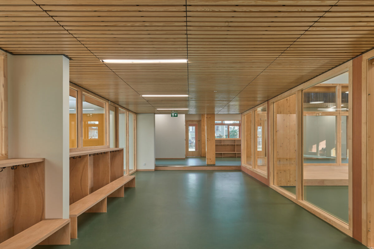The new group rooms include a balcony on the first floor and a covered outdoor area on the ground floor. The canopied balcony for the upper grades functions as sports field bleachers, a vegetable plot, a space for outdoor education and an awning. The pots and containers from the vegetable plot and climbing plants enhance the school’s green appearance, providing cooling, promoting biodiversity and supporting climate adaptation.