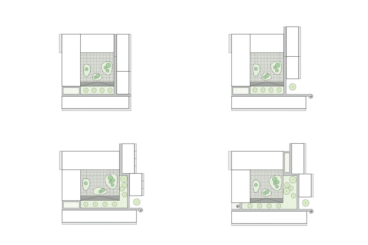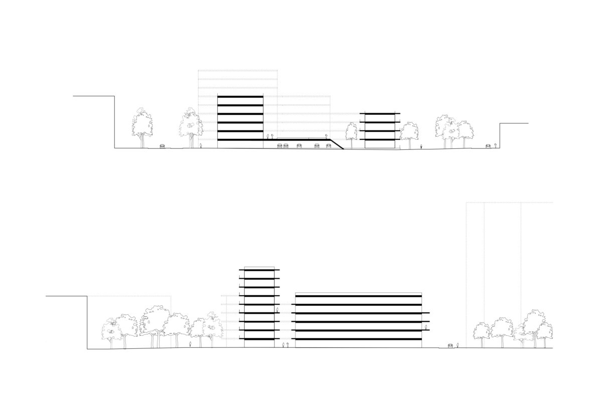 The three-building ensemble responds to the reinforced green structure. Residents can enjoy views of mature trees from the green courtyard garden, along with the newly planted tree-lined ’s-Gravendijkdreef and the lush Kantershofpad. Bridges and stairways connect the buildings, creating gathering points beneath the tree canopies in the courtyard. The community centre at the end of ’s-Gravendijkdreef, along with the entrance to the care centre and the general practice on Karspeldreef, imbue the buildings with a vibrant character and enliven the public space. Views of the green courtyard garden create a connection between the cluster and its surroundings, transforming the previously closed building envelope into a composition that is light, open and transparent.