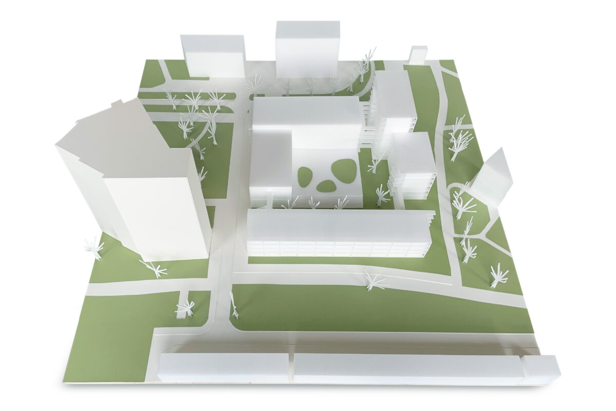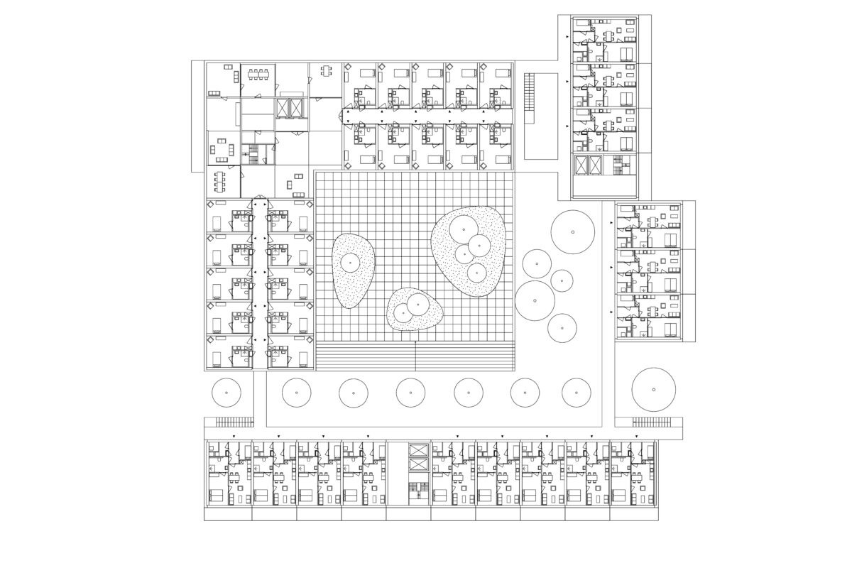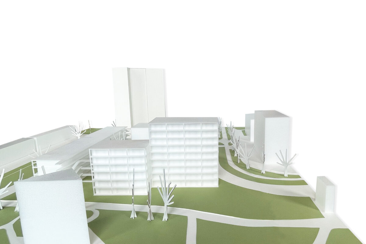Programme 80 apartments ([surface area / GO] 63 m², 51 rented social dwellings, 31 non-controlled rented dwellings), a care centre with 8 group homes (with 10 studio units each), a GP practice, a hospice (10 units), community space and communal bicycle sheds (total GFA 14,300 m2)
